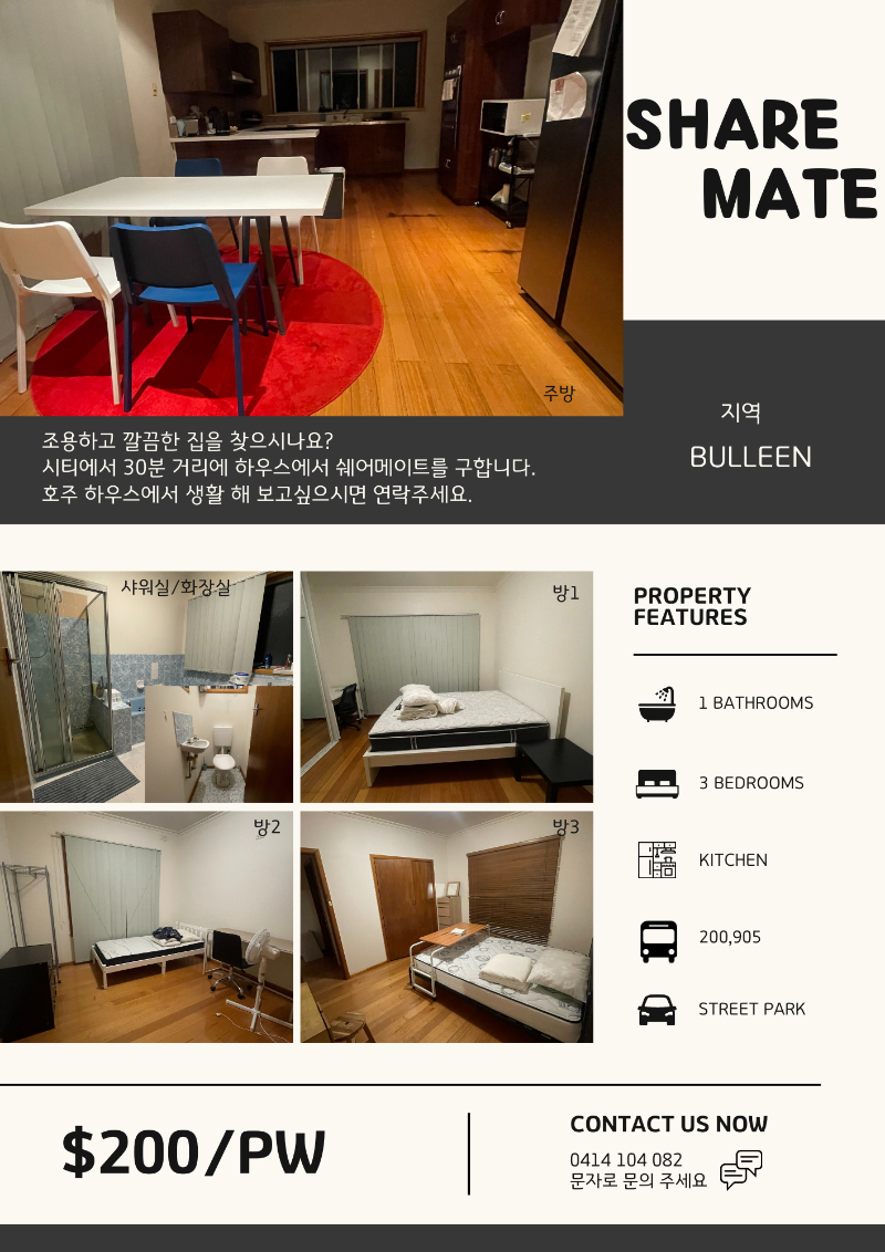 BULLEEN에 있는 하우스에서 쉐어하실분을 구하고 있습니다
