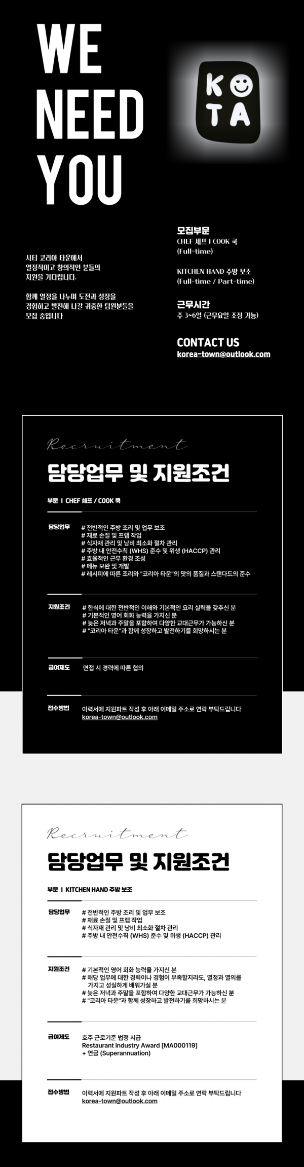 [시티 코리아타운] 셰프(CHEF).쿡(COOK).주방보조(KITCHEN HAND) 채용 공고