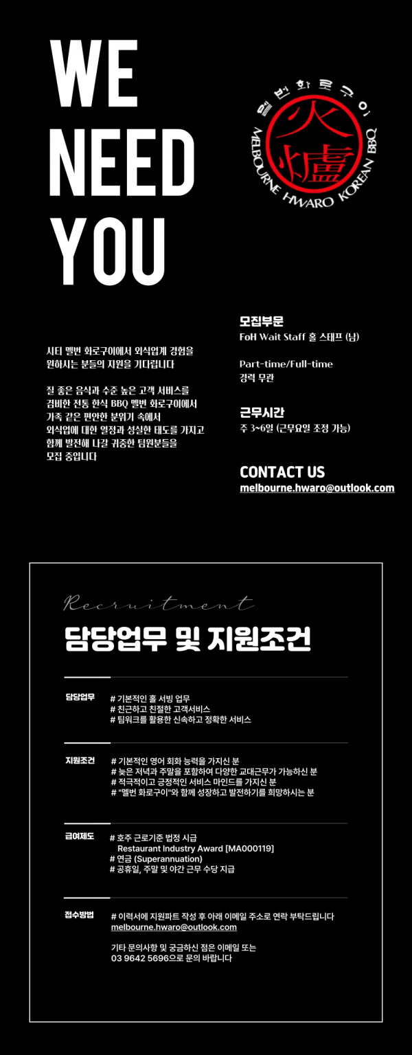 melbourne.hwaro@outlook.com으로 이력서 첨부하여 연락 부탁드립니다