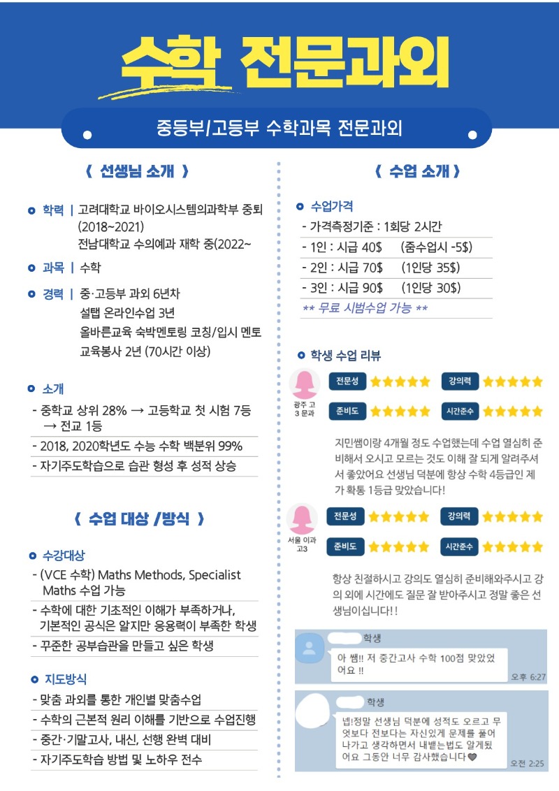고려대학교 수학전문과외 (온라인/오프라인) 지민7311 0 15732 2023.12.30 09:12 0448-544-433 ariana07311@gmail.com 무료 시범과외 가능합니다. 문자나 메일로 문의 부탁드립니다!