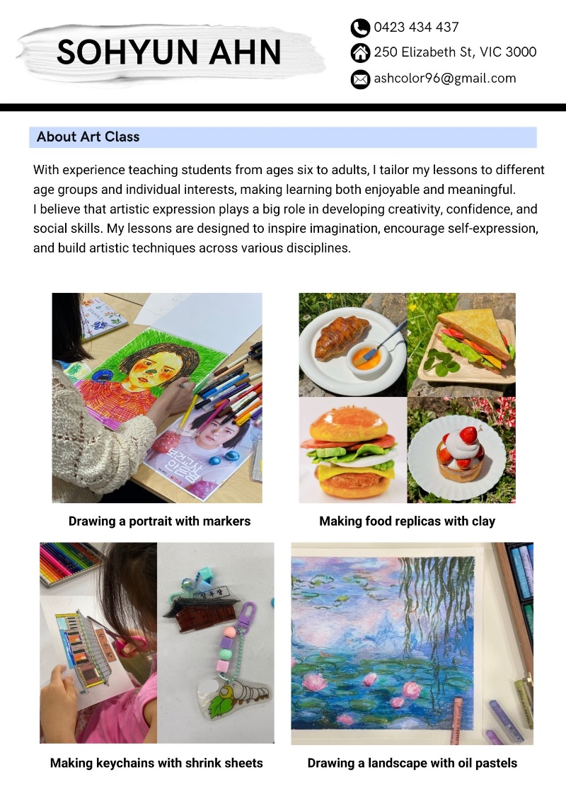 그래서 탄탄한 미술 수업 뿐만 아니라 심리학 복수전공을 한 지식을 바탕으로 자녀들의 정서적 안정 및 발달을 도와드릴 수 있습니다!^^
