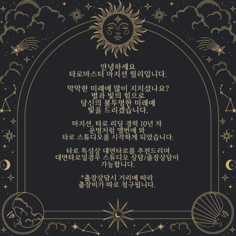 타로와 심리상담을 접목해 당신의 상처와 고민을 보듬아드립니다.
