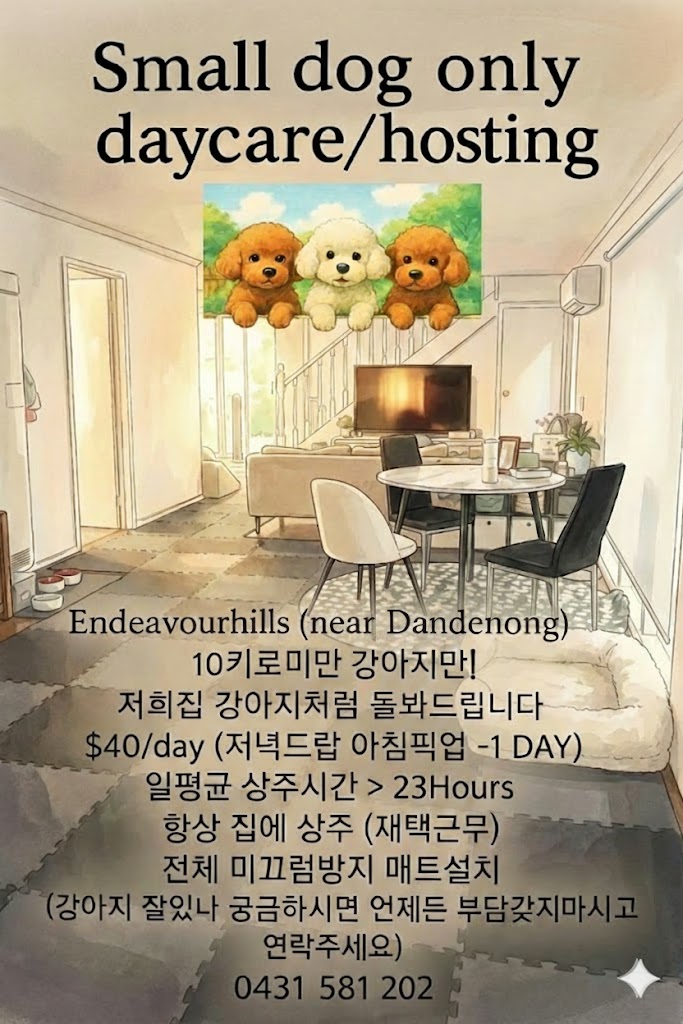엔데버힐스(Endeavour Hills) (단데농근처) 에서 소형견 (10Kg)미만 강아지 저희 강아지처럼 돌봐드립니다.